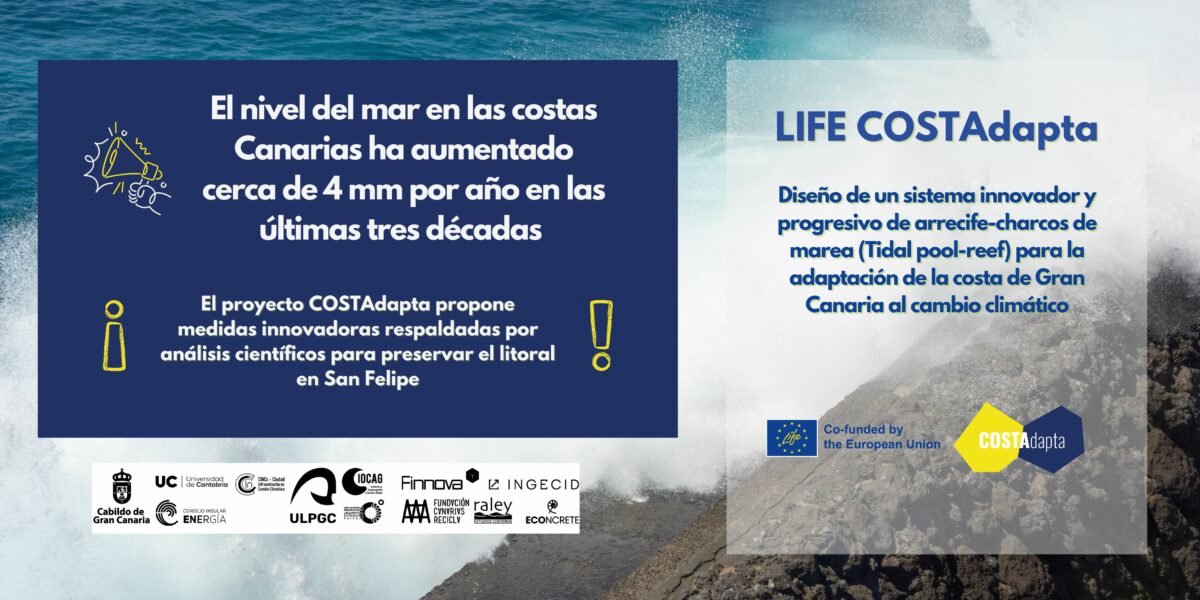 LIFE COSTAdapta es un proyecto innovador liderado por el Consejo Insular de Energía de Gran Canaria (CIEGC) y cofinanciado en un 60% por la Unión Europea a través del Programa LIFE. Con una duración de 7 años y un presupuesto total de 3.409.864 EUR, LIFE COSTAdapta diseñará y ensayará un sistema progresivo de arrecifes-charcos de marea (Tidal pool-reef), que combine técnicas tradicionales con soluciones avanzadas para la adaptación costera.