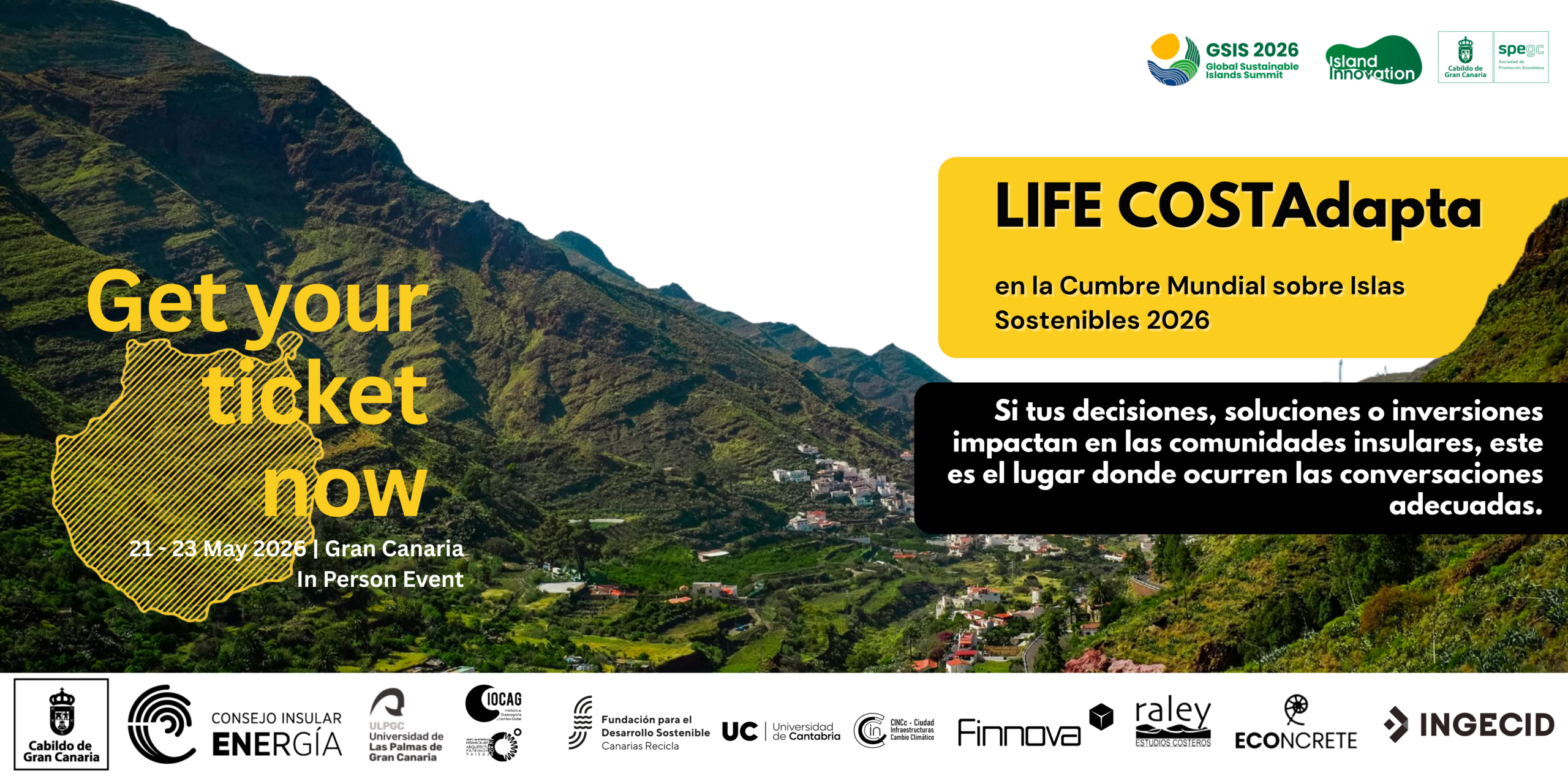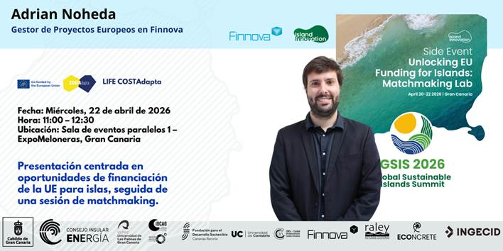 Gran Canaria, abril de 2026. El proyecto europeo LIFE COSTAdapta participa en el Global Sustainable Islands Summit 2026, que se celebra del 20 al 22 de abril en ExpoMeloneras, Gran Canaria, organizado por Island Innovation en colaboración con el Cabildo de Gran Canaria. En este foro internacional, que reúne a más de 500 representantes de gobiernos, instituciones, empresas y academia de más de 100 territorios insulares, el consorcio del proyecto presenta soluciones innovadoras frente al cambio climático, con el objetivo de reforzar la resiliencia costera y fomentar la cooperación internacional en territorios insulares.